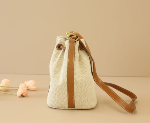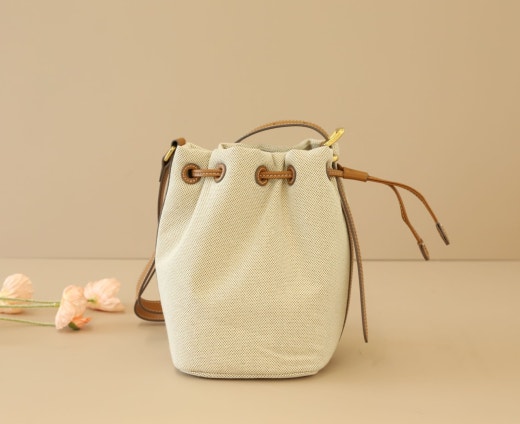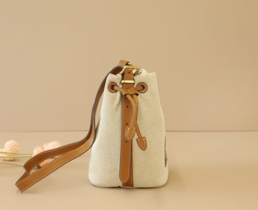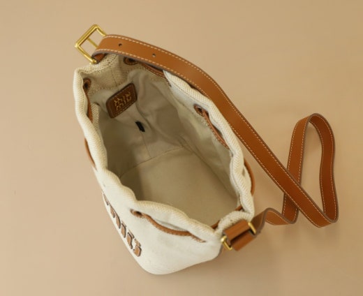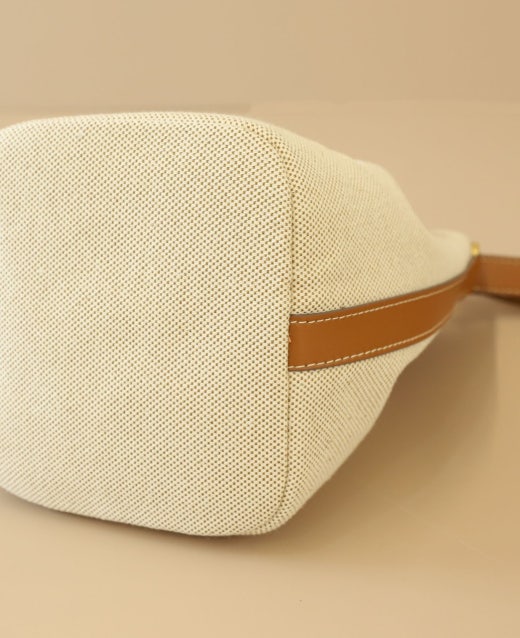 - 대비되는 소재와 컬러의 캔버스 및 가죽 버킷 백입니다.