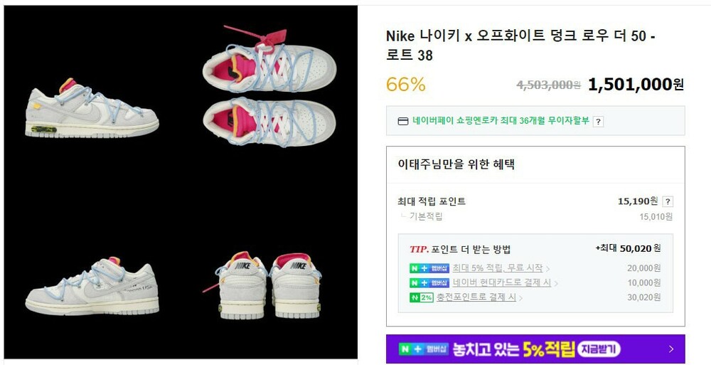 나이키 X 오프화이트 콜라보 덩크 로우 더 50 - 로트 38 남여공용(1컬러)