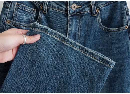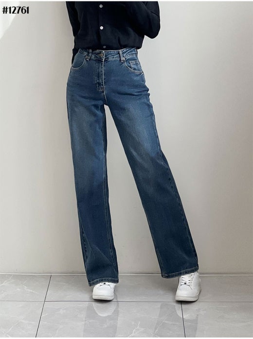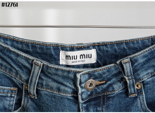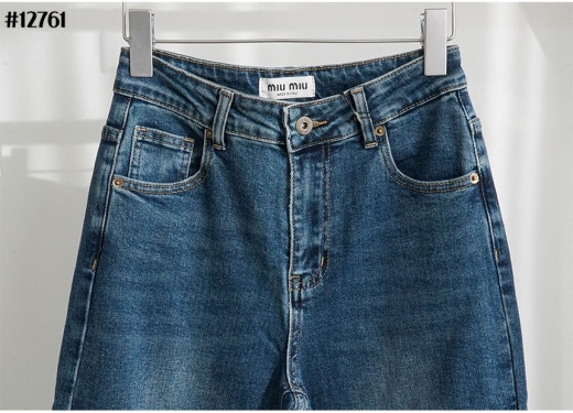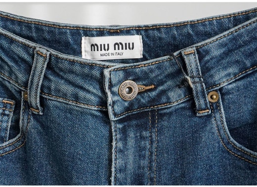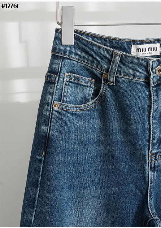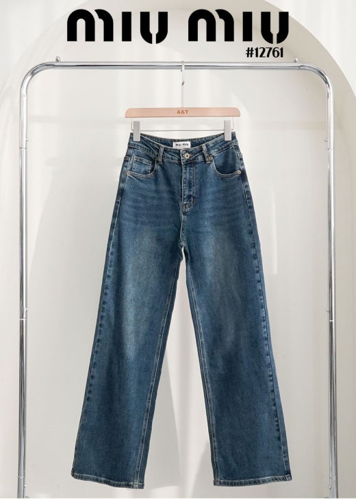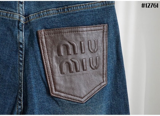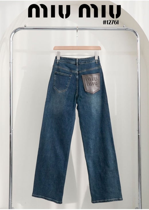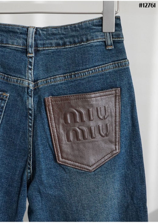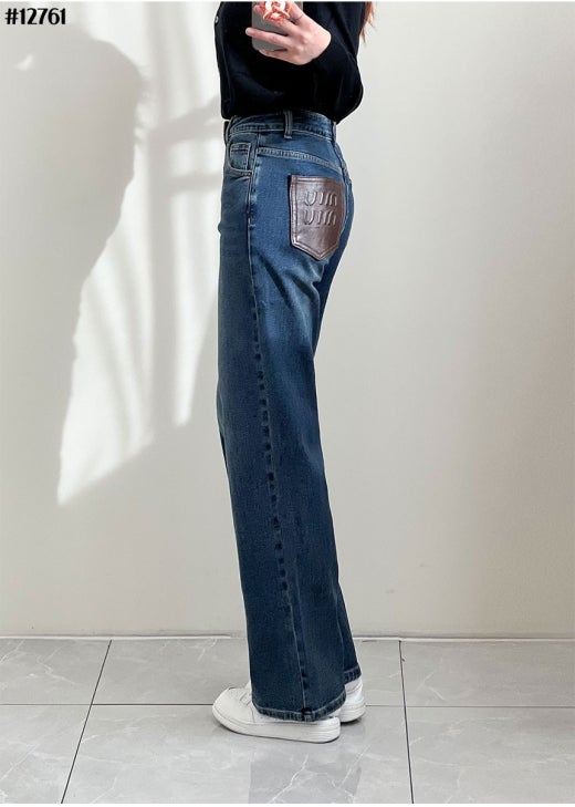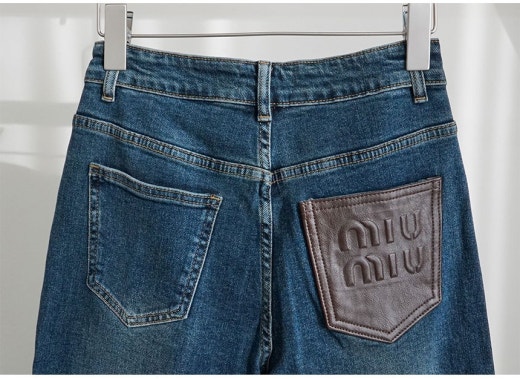 미우미우 브라운 레더 패치 와이드 데님 팬츠 진청 여성용(1컬러)