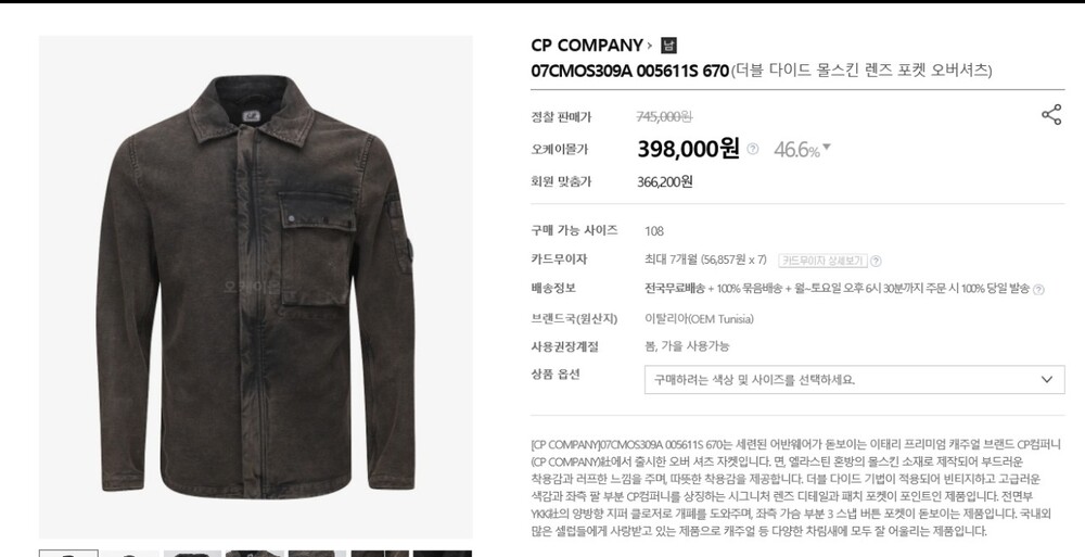 CP컴퍼니 더블다이드 몰스킨 렌즈셔츠 자켓 남성용(2컬러) 📢세일