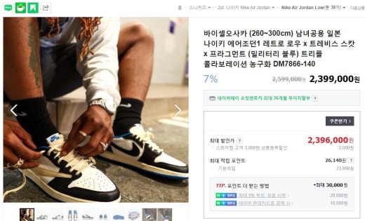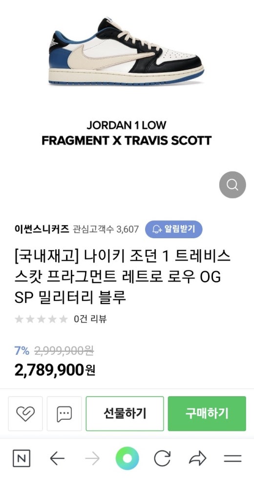 나이키 X 트레비스 스캇 X 프라그먼트 X 에어 조던 1 로우 캑터스 잭 로얄 남여공용(1컬러)