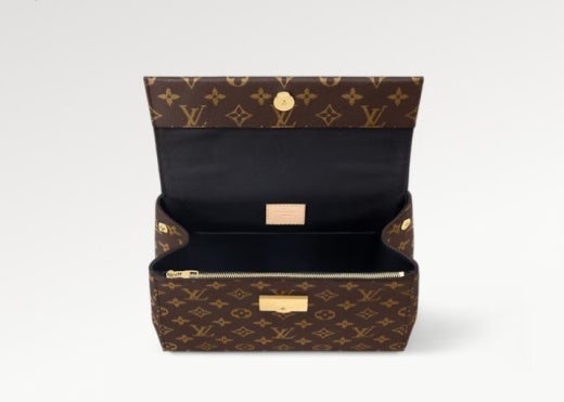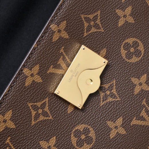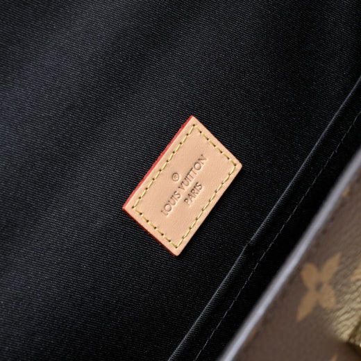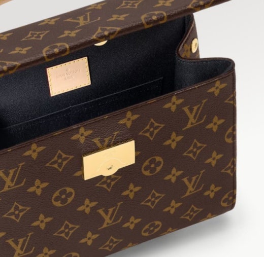 모노그램 코팅 캔버스 천연 카우하이드 가죽 소재의 트리밍 텍스타일 소재의 안감 골드 색상 하드웨어 자석형 플랩 잠금장치 키 벨 내부 플랫 포켓 2개 내부 지퍼형 포켓 밑면의 보호용 금속 스터드 4개