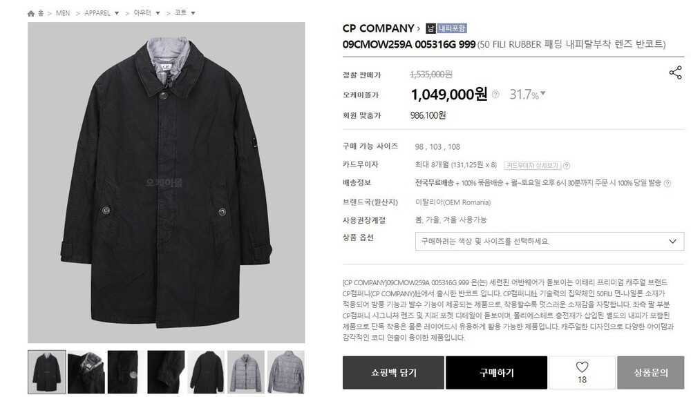 CP컴퍼니 3 in 1 다비드 내피 탈부착 렌즈 반 코트자켓 남성용(1컬러)3 in 1 다비드 내피 탈부착 렌즈 반 코트자켓 남성용(1컬러)