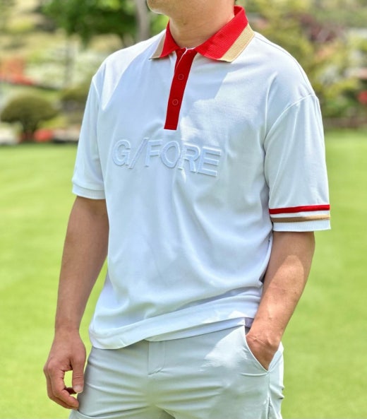 ➡️ 앞가슴 고급스러운 질감의 G/FORE 로고로 오리지널티를 높임.