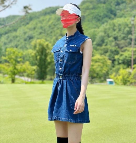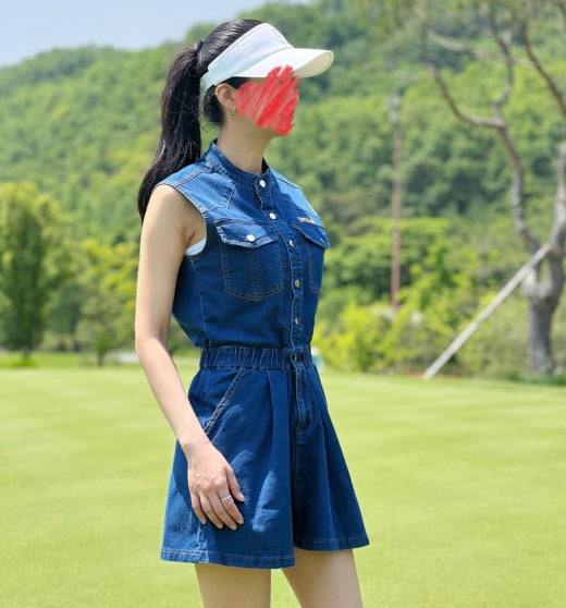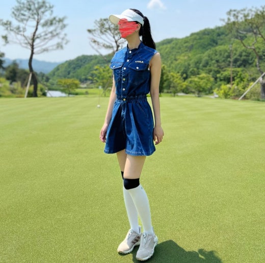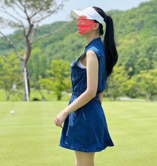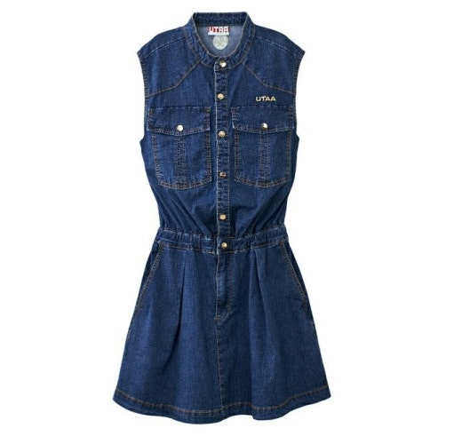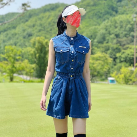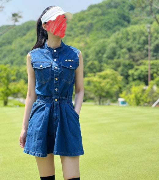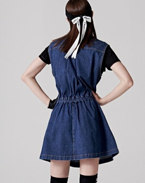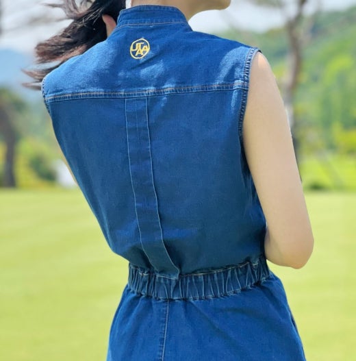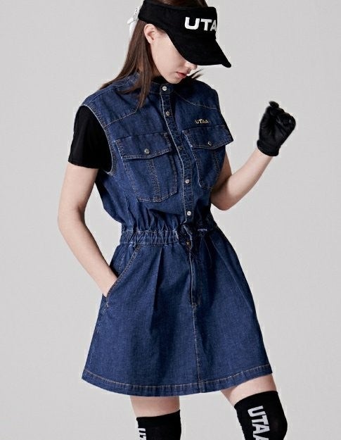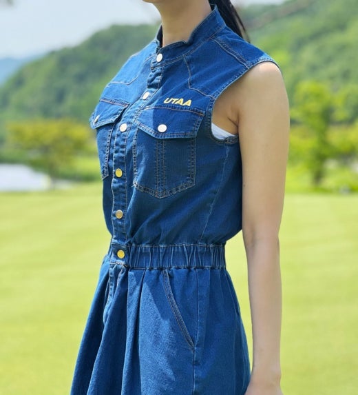 ➡️ 빅 블럭 포켓과 버튼 포인트 , 로고 자수 디테일 포인트의 슬리브리스 헨리넥 데님 원피스