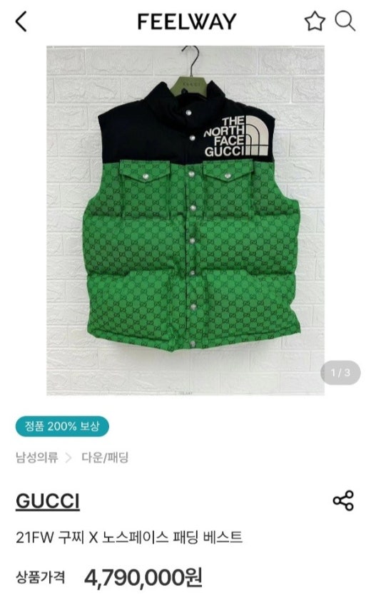 구찌 x 노스페이스 패딩 베스트 조끼 그린 남여공용(1컬러)