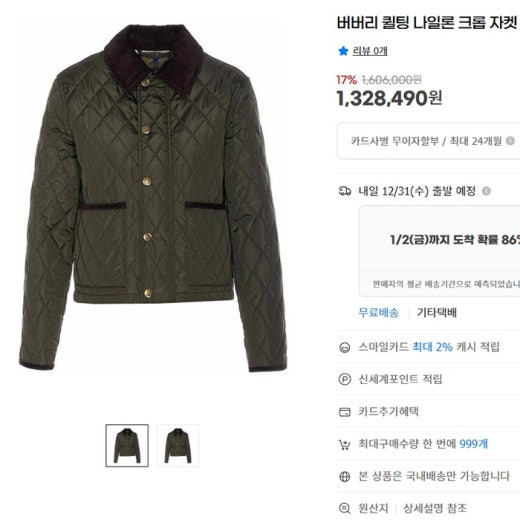 버버리 퀄팅 나일론 크롭 자켓 블랙 여성용(1컬러) ⚓221